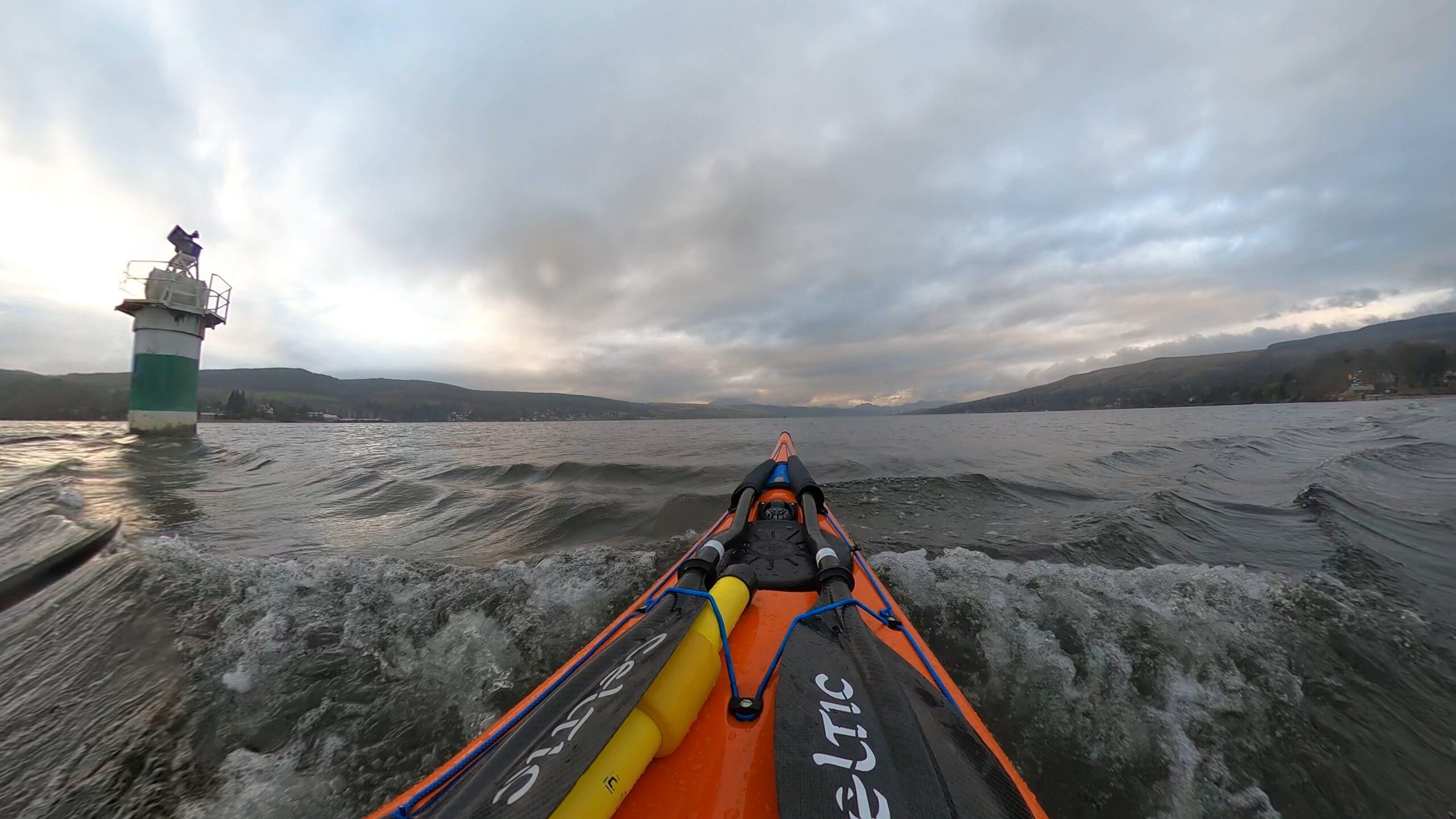I paddled down the loch towards Rhu with the tide. There was a little tidal race on Rhu Narrows, so I had a play in the currents, before crossing over to Helensburgh Sailing Club. I was surprised just how quick the Romany Surf was, but then I was running with the tide, albeit into a south easterly breeze, so I was largely protected from the wind. Consequently, my return would be against the tide, with a wind coming at my rear quarter on the open stretches. I found I needed just a little bit of skeg, crossing the bay to Rhu Narrows, to stop the boat from cocking into the wind. With no submarines entering the loch, I made my way through the narrows, getting a wave from the walkers on the spit, before heading back into Gareloch.