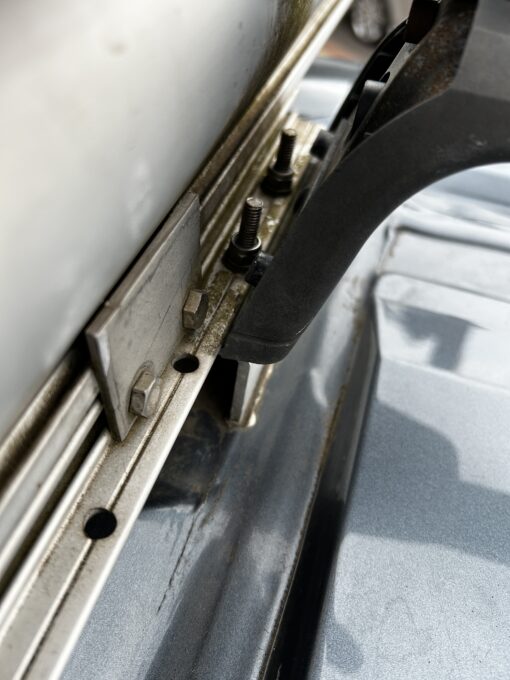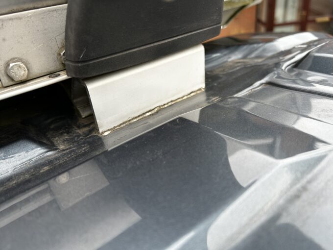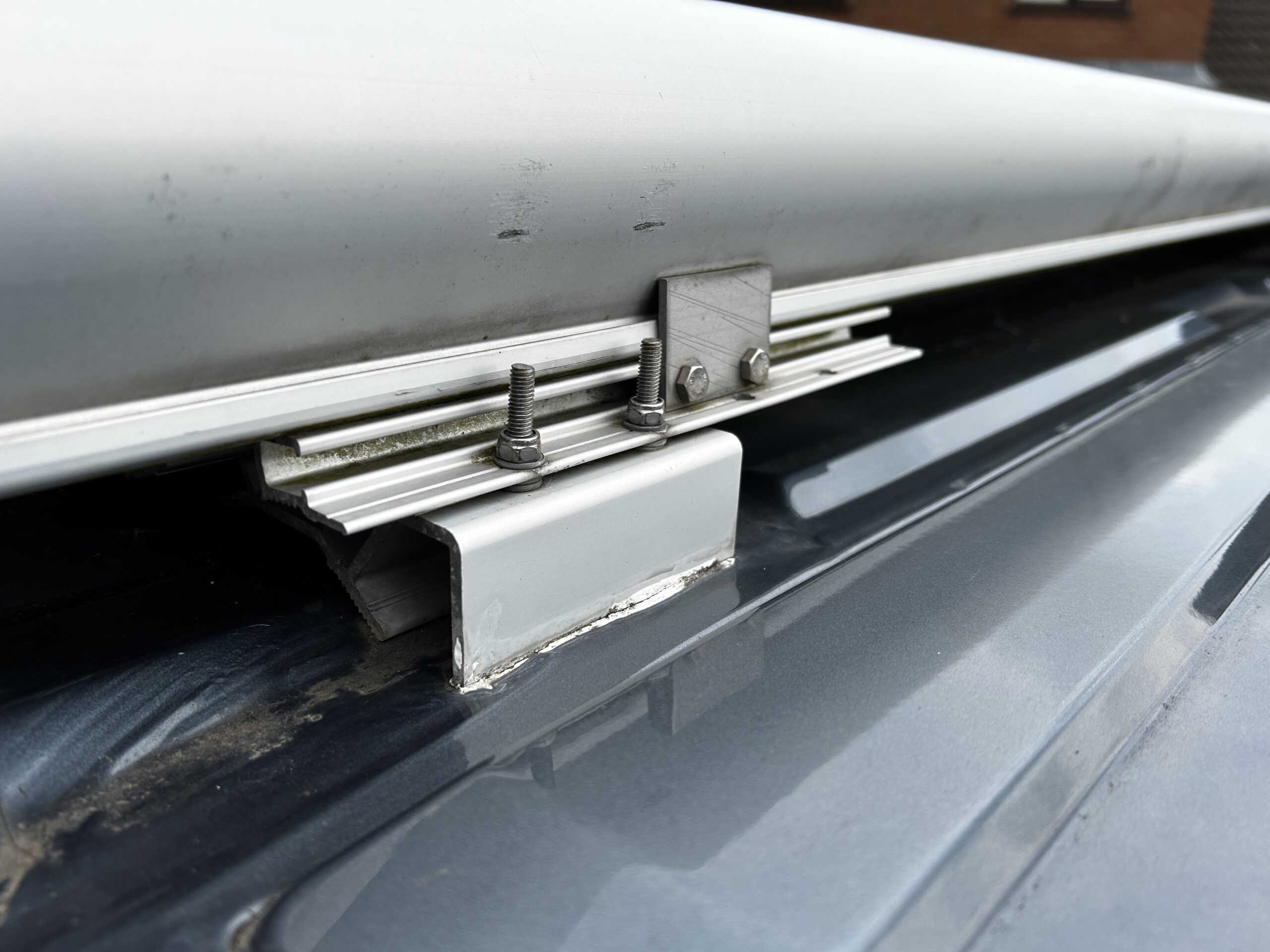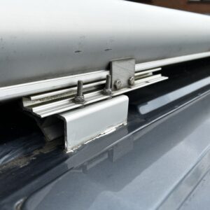 As you will see from the photo above the awning connection on my Wildax Aurora is raised above the roof using aluminium raised mounting platforms. These aluminium raised mounting platforms are effectively a clamp, which are used to clamp the awning onto the vans mounting points.